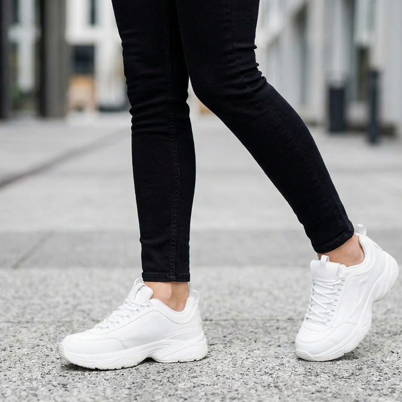 Pro moderní kontrast: Aktuální trend (především u žen) velí kombinovat úzké džíny s robustními teniskami (chunky sneakers). Tento kontrast upnutých kalhot a objemné boty vytváří velmi stylový a mladistvý vzhled.