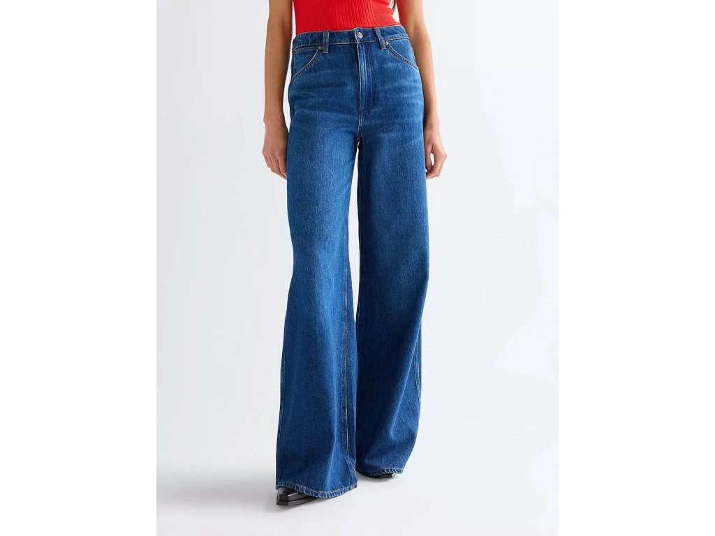 - střih: A-line wide leg, fitted seat, natural rise waist