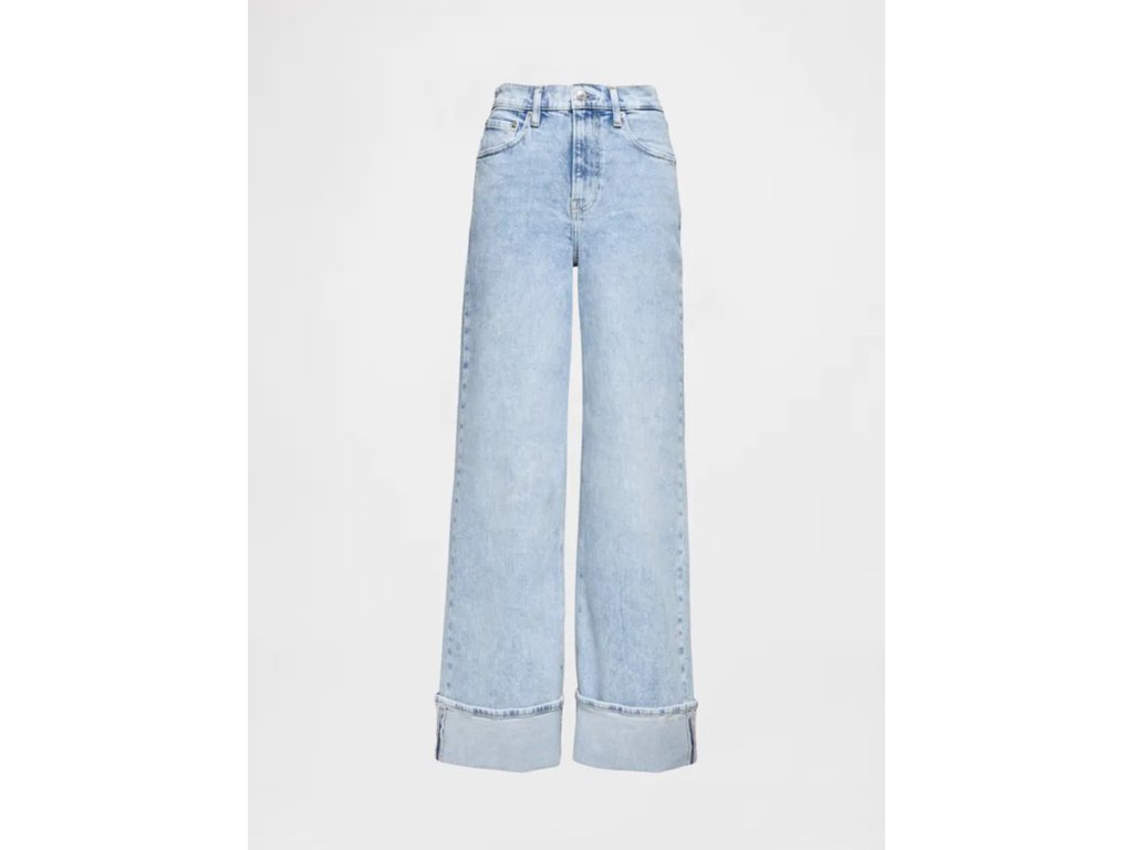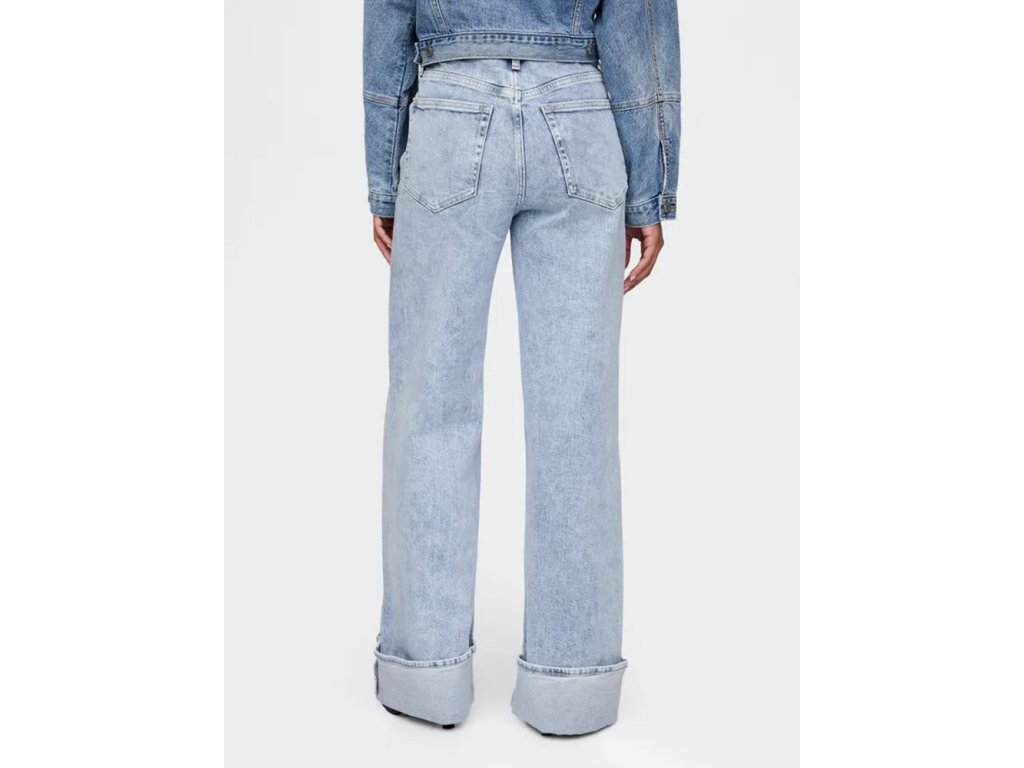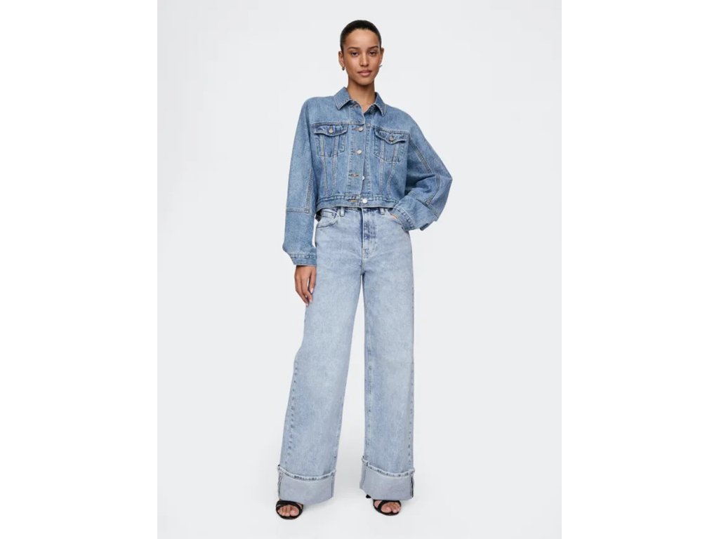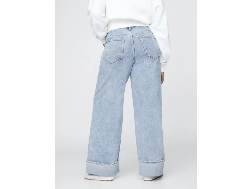 Střihem jde o nadčasové džíny s vysokým pasem, které hezky přiléhají v oblasti pasu a boků a poté se volně rozvírají do plné šířky po celé délce nohavic. Díky světle modré barvě s jemným praním působí svěže a nezatěžují outfit – snadno je sladíte s bílým tričkem, mikinou i s crop topem. Nohavice mají elegantní pád a můžete je nosit v plné délce nebo s ležérním ohrnutím pro nenucený city vibe. Materiál je z převážně bavlněného denimu s příměsí elastanu, který se přizpůsobí pohybu, ale drží tvar a kontury.