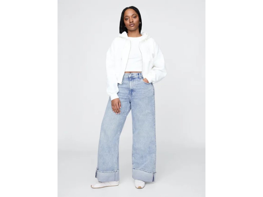 Šířka nohavice u kotníku je 61 cm, takže efekt wide leg zůstává výrazný i u kratších délek. Pokud preferujete užší, více “fit” vzhled přes boky a pas, zvažte volbu o jedno číslo menší velikosti. Modelky ve velikosti 27 měří 172–180 cm (pas 60–66 cm, boky 84–97 cm) a ve velikosti 33 (pas 86–91 cm, boky 114–127 cm) – snadno si tak odvodíte, jak by džíny seděly právě vám.