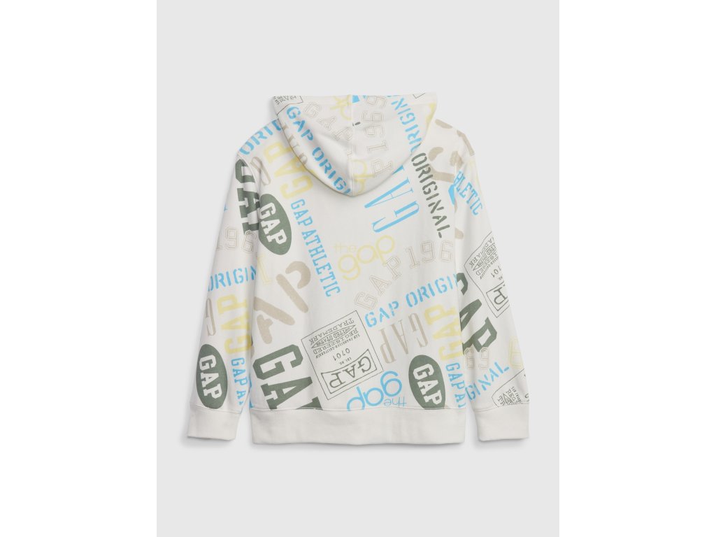 Dětská mikina s kapucí. Střih přes hlavu a klokaní kapsa. Vícebarevný logo vzor. Dlouhé rukávy s náplety. Na vnitřní straně French Terry.Doplňkové parametry