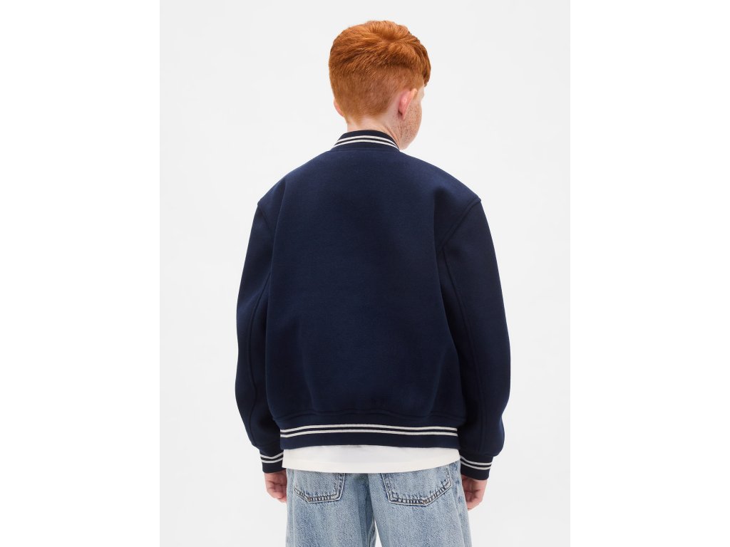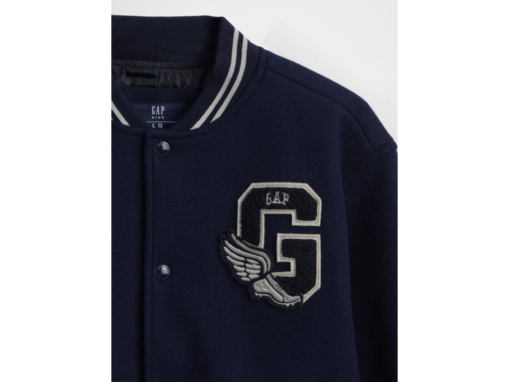 Chlapecký bomber spojuje pohodlí a sportovní styl inspirovaný univerzitní módou. Je vyroben z měkké imitace vlny a doplněn hladkou taftovou podšívkou v těle i rukávech. Stojáček s proužky, zapínání na patenty po celé délce a dlouhé rukávy zakončené žebrovanými manžetami podtrhují klasický vzhled bomberu. Kontrastní varsity „G“ logo Gap s grafikou na hrudi a dvojité sportovní pruhy na límci, manžetách i spodním lemu dodávají bundě univerzitní styl. Tento model byl vyroben v továrně zapojené do programu RISE, který podporuje rovnost pohlaví a posílení postavení žen. Relaxed fit střih je rovný a volný s uvolněnými rukávy. Délka sahá do pasu. Pokud preferujete užší střih, doporučujeme zvolit o číslo menší velikost.Doplňkové parametry