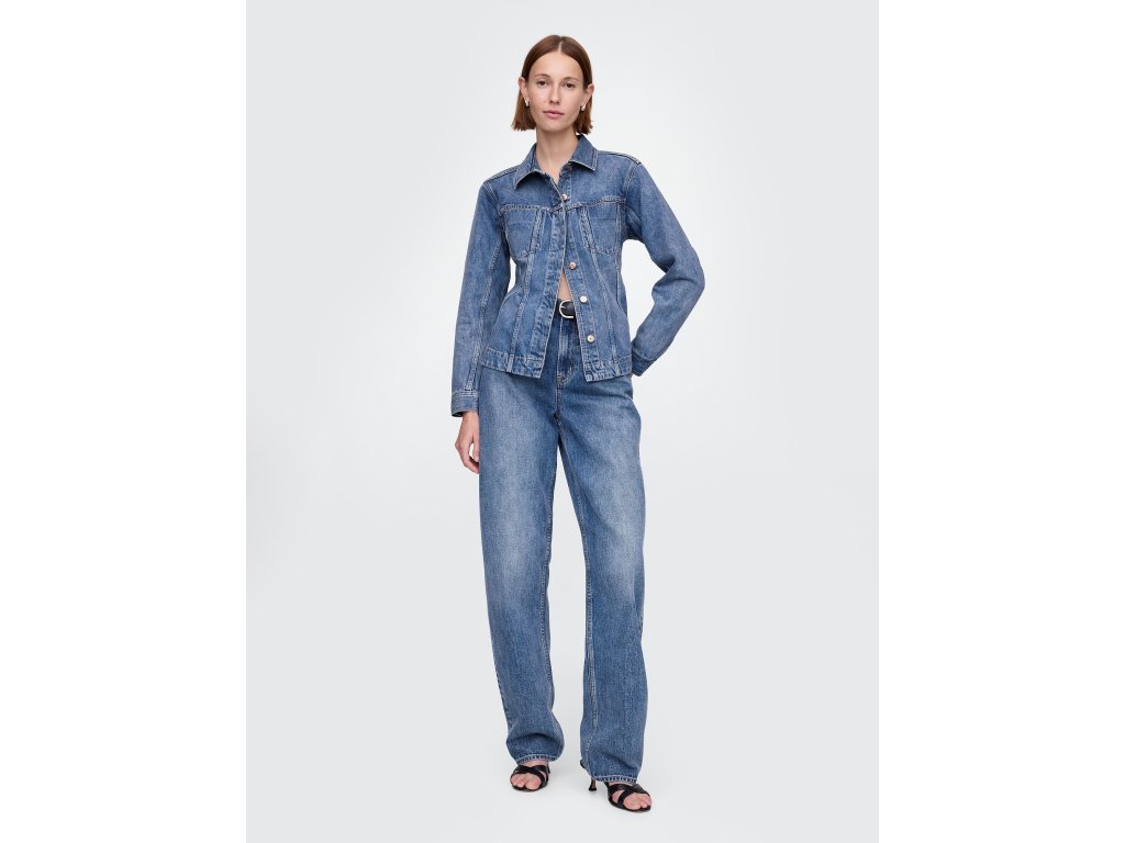 Klasická džínová bunda z pevného denimu bez elastanu je jedinečným kouskem pro milovnice nadčasového stylu. S límečkem, knoflíkovým zapínáním a dlouhými rukávy zakončenými manžetami na knoflíky spojuje nenucenou ležérnost s elegancí. Praktické našité kapsy na přední straně podtrhují její ikonický vzhled. Bunda je součástí programu Washwell, díky kterému se při výrobě spotřebuje o 20 % méně vody než běžnými metodami. Obsahuje 5 % recyklované bavlny, čímž přispívá ke snížení spotřeby nových surovin i odpadu. Výroba probíhá v továrnách, které podporují rovnost pohlaví a posilují postavení žen prostřednictvím programů RISE a P.A.C.E., zaměřených na rozvoj dovedností a sebevědomí. Střih bundy je precizně navržen tak, aby seděl těsně na těle, s délkou sahající do oblasti boků, což zvýrazňuje siluetu a dodává sofistikovaný vzhled. Modelka s velikostí S měří 172–180 cm, zatímco velikost XL je ideální pro postavy s proporcemi 86–91 cm v pase a 114–127 cm přes boky.Doplňkové parametry