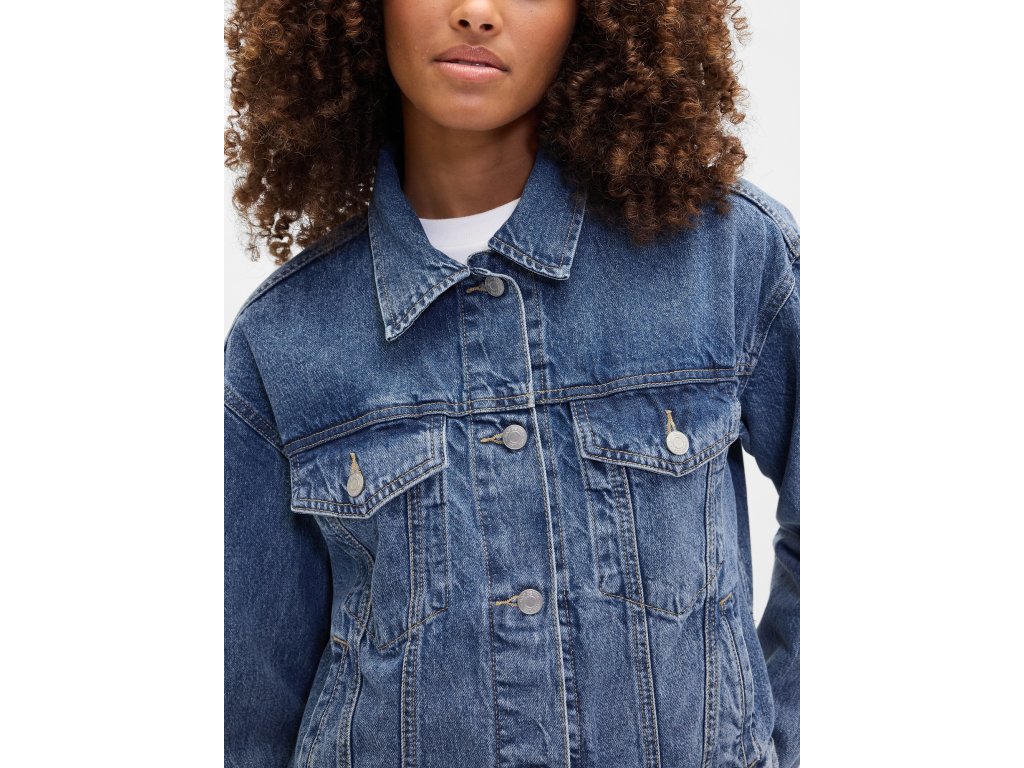 Dámská džínová bunda z pevného denimu bez streče v klasickém středně modrém odstínu s jemným vyšisováním přináší nadčasový styl a odolnost. Obsahuje 5 % recyklované bavlny, která pomáhá šetřit přírodní zdroje a snižovat množství odpadu, a je součástí programu Washwell, jenž při úpravě denimu využívá alespoň o 20 % méně vody než běžné metody. Bunda má spadlá ramena, dlouhé rukávy s manžetami na knoflík, klasický límec a zapínání na knoflíky po celé délce. Na hrudi najdete našité kapsy s patkou a knoflíkem, spodní lem je doplněn páskem pro lepší tvarování. Vyrobena byla v závodě zapojeném do iniciativy RISE, která podporuje rovnost pohlaví a posilování postavení žen. Materiál: 95% Cotton Better Cotton (Bci), 5% Cotton RecycledDoplňkové parametry