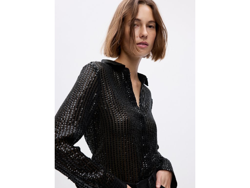 Dámská košile s flitry. Límeček a zapínání na knoflíčky. Dlouhé rukávy s manžetou. Zaoblený spodní lem. Jednobarevná a lesklá.Doplňkové parametry