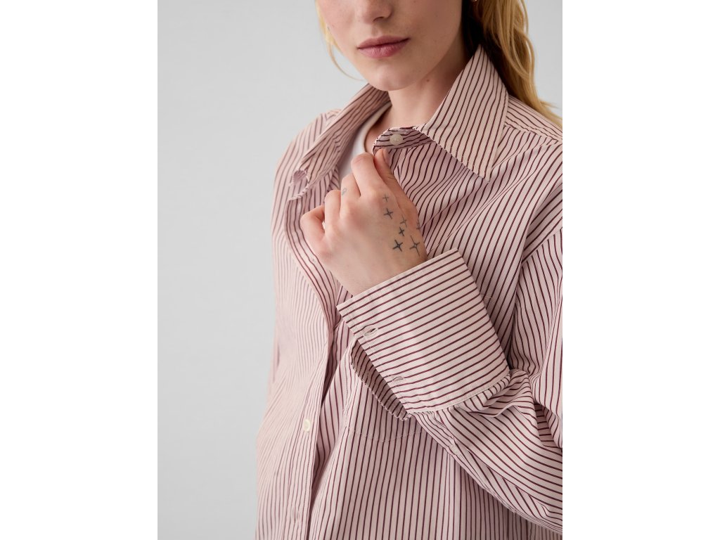 Oversize dámská košile z bavlněného popelínu. Stylový a nadčasový kousek. Dlouhé rukávy. Praktická náprsní kapsa. Oversize nadměrný střih. Délka k bokům. Pro klasický střih zvolte o jednu až dvě velikosti menší. Modelky nosící velikost S (Gap) mají výšku 172–180 cm a míry pasu 60–66 cm a boků 84–97 cm. Modelky nosící velikost XL (Gap) mají výšku 172–180 cm a míry pasu 86–91 cm a boků 114–127 cm. Materiál: 100% Cotton OrganicDoplňkové parametry