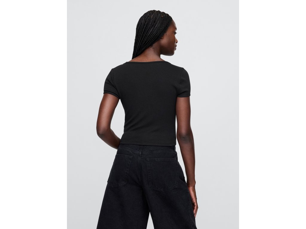 Dámské tričko z extra jemné směsi modalu ve zkráceném střihu je lehký a příjemně přiléhavý základ šatníku, ideální pro kombinování s oblíbenými kalhotami nebo sukní s vyšším pasem. Směs bavlny a modalu zajišťuje mimořádnou hebkost, pružnost a prodyšnost, díky čemuž se tričko příjemně nosí po celý den a jemně obepíná tělo bez pocitu stažení. Kulatý výstřih a krátké rukávy působí jemně a žensky, zatímco extra zkrácená délka končící nad pasem dodává moderní siluetu, kterou oceníte jak při vrstvení, tak při samostatném nošení v teplejších dnech. Vyrobeno v továrně zapojené do programů RISE a P.A.C.E. společnosti Gap Inc., které podporují rovnost žen a mužů a investují do rozvoje dovedností, sebevědomí a odolnosti pracovníků v oděvním průmyslu. Stretch-to-Fit střih: přiléhavý, přizpůsobivý materiál pro lichotivý vzhled. Ultra zkrácená délka sahá nad pas. Modelky ve velikosti S měří 172–180 cm, mají pas 60–66 cm a boky 84–97 cm. Modelky ve velikosti XL mají pas 86–91 cm a boky 114–127 cm. Materiál: 58% Cotton Better Cotton (Bci), 39% Modal Conventional, 3% Elastane Conventional SpandexDoplňkové parametry