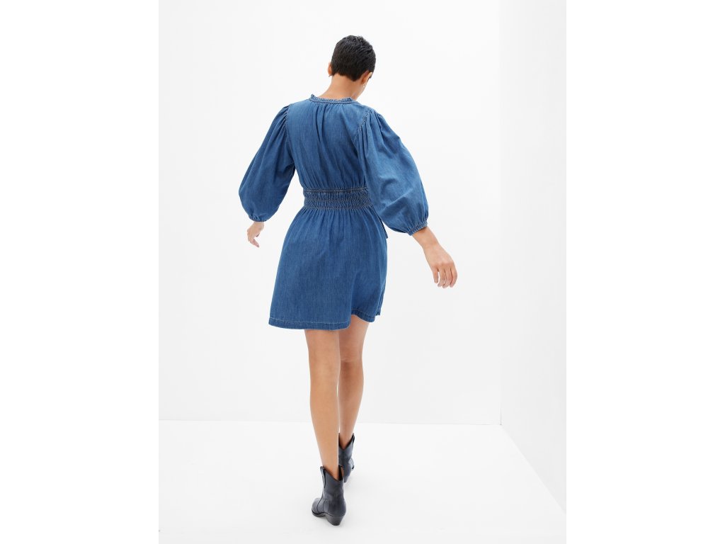 Dámské džínové šaty. 100% organická bavlna. Mini délka. U krku rozhalenka na zavazování. Zvýrazněný pružný pas. Nabírané balonové rukávy 3/4 délky.Doplňkové parametry