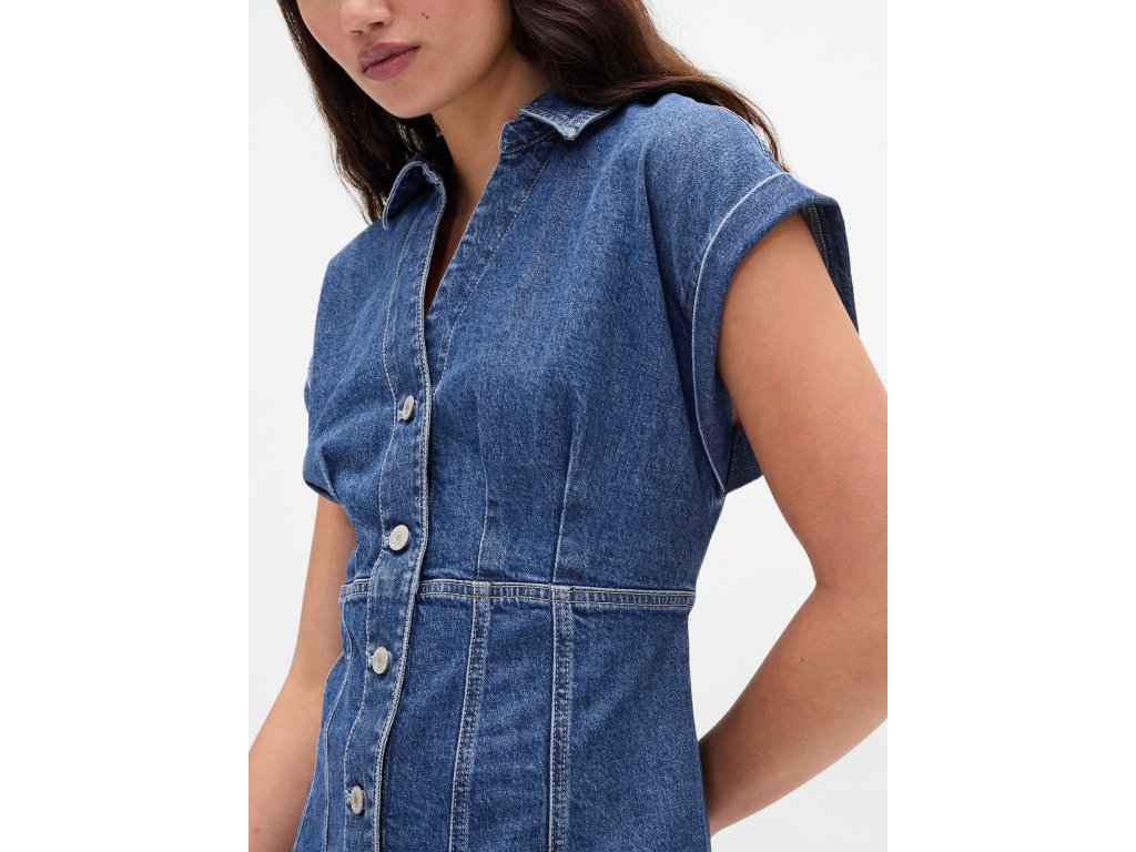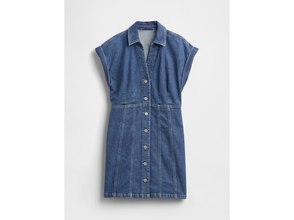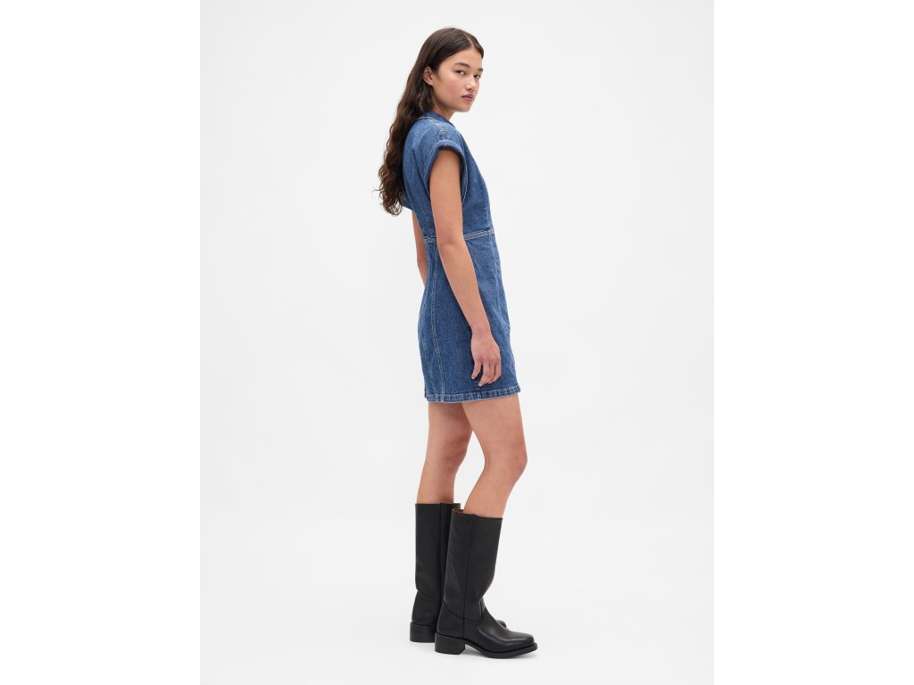 Dámské džínové mini šaty v áčkovém střihu přinášejí spojení klasického denimu s ženskými detaily. Ušité z autentického denimu s nízkým podílem streče, příjemně drží tvar a zároveň nabízejí pohodlí. Šaty mají límeček do V, krátké ohrnuté rukávy, zapínání na knoflíky a jemné sklady na živůtku, které dodávají ženský tvar. Švy po celé délce sukně zvýrazňují siluetu. Vyrobeno z 5 % recyklované bavlny a v rámci programu Washwell, který snižuje spotřebu vody při praní o alespoň 20 % oproti běžným metodám. Produkt vznikl ve výrobním závodě zapojeném do iniciativy RISE, podporující rovnost pohlaví a posílení postavení žen. Klasický střih s volnější áčkovou siluetou a rozšířeným lemem sahá nad kolena. Modelky ve velikosti Gap S měří 172–180 cm, mají pas 60–66 cm a boky 84–97 cm, modelky ve velikosti Gap XL měří 172–180 cm, pas 86–91 cm a boky 114–127 cm. Materiál: 94% Cotton Better Cotton (Bci), 5% Cotton Recycled, 1% Elastane Conventional LycraDoplňkové parametry