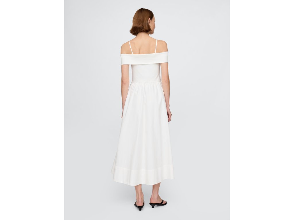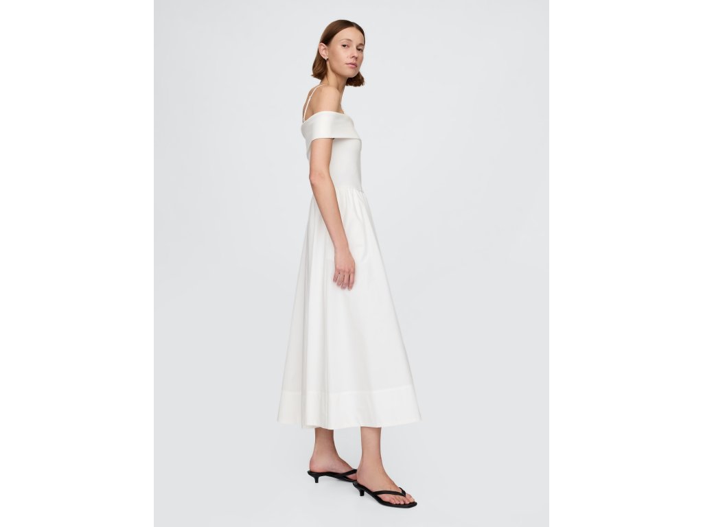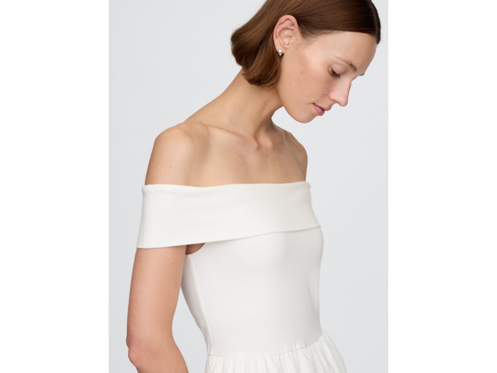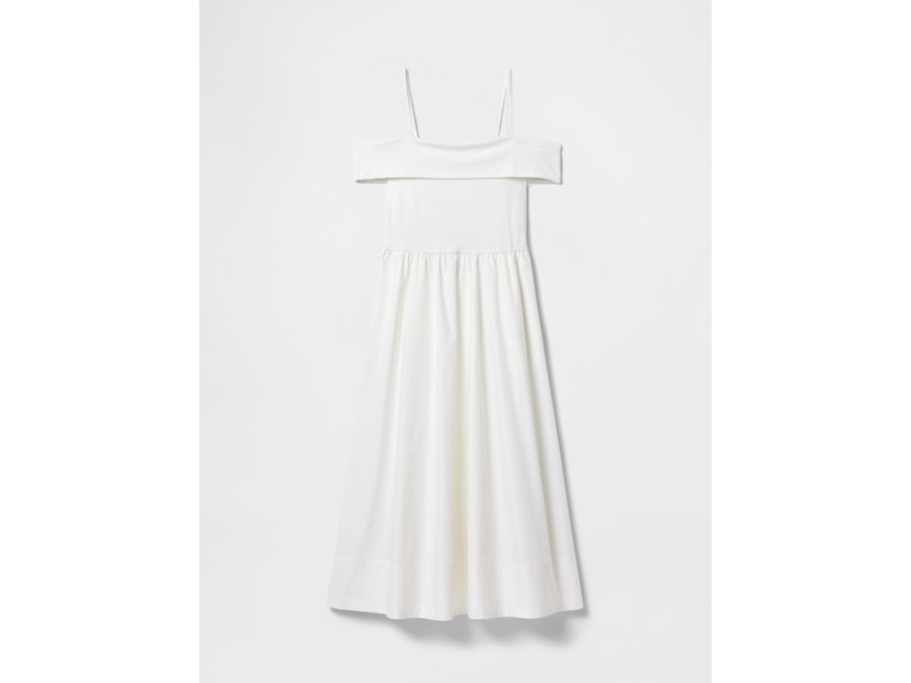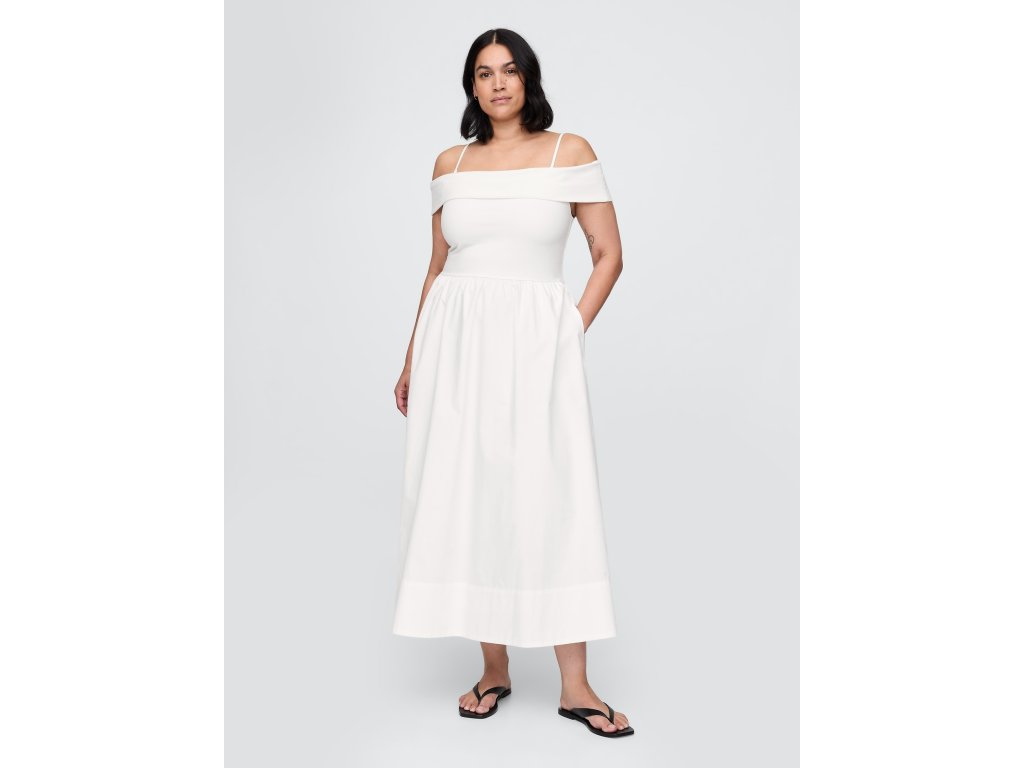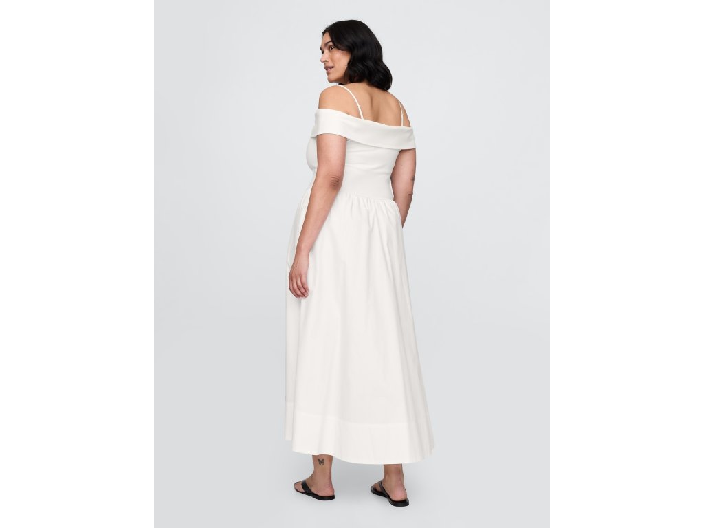 Dámské midi šaty s odhalenými rameny spojují eleganci, pohodlí a všestranný styl. Měkká a pružná bavlněná směs zajišťuje příjemný pocit na těle, zatímco výstřih s odhalenými rameny dodává šatům ženský a sofistikovaný vzhled. Nastavitelná a odnímatelná špagetová ramínka umožňují nosit šaty s ramínky pro větší oporu nebo bez nich pro odvážnější look. Šikmé boční kapsy dodávají ležérní a praktický detail, díky kterému jsou šaty ideální na různé příležitosti. Střih slim fit & flare zahrnuje přiléhavý živůtek a sukni, která se směrem od pasu volně rozšiřuje. Midi délka pod kolena působí nadčasově a elegantně, což dělá z těchto šatů univerzální kousek pro každodenní i formálnější outfity. Modelky ve velikosti S měří 172–180 cm, mají obvod pasu 60–66 cm a boky 84–97 cm. Modelky ve velikosti XL měří 172–180 cm, mají obvod pasu 86–91 cm a boky 114–127 cm. Materiál: Upper Body 88% Cotton 12% Elastane, Skirt 100% Cotton, Skirt Lining 100% Cotton, Shelf Bra 60% Cotton 40% PolyesterDoplňkové parametry