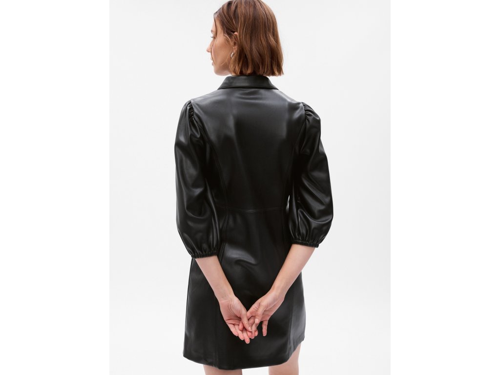 Dámské mini šaty. Z umělé kůže. Zapínání na knoflíky. Límeček a balónové rukávy. Jednobarevné.Doplňkové parametry