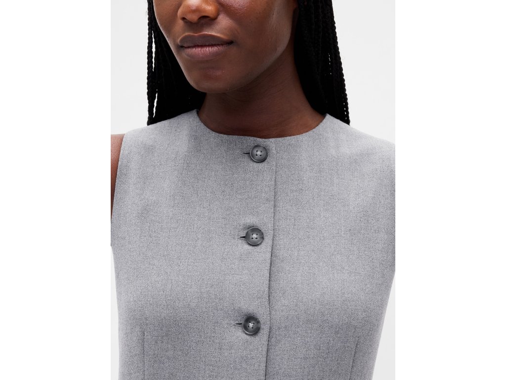 Dámská vesta ze strečového twillu spojuje nadčasový styl a moderní pohodlí. Twill je tkanina se šikmou keprovou vazbou, která jí dodává hladký povrch, jemnou strukturu a odolnost. Vesta má vysoký kulatý výstřih, je bez rukávů a zapíná se na knoflíky po celé délce. Přední část zdobí falešné lištové kapsy a decentní rozparek. Celá vesta je podšitá pro uhlazený vzhled. Vyrobena ze 63 % recyklovaného polyesteru, čímž se snižuje spotřeba přírodních zdrojů a množství. Tento model pochází z továrny zapojené do programu RISE podporujícího rovnost pohlaví a posílení postavení žen. Střih Classic je rovný a pohodlný, délka sahá do oblasti boků. Modelky ve velikosti S měří 172–180 cm, mají pas 60–66 cm a boky 84–97 cm. Modelky ve velikosti XL měří 172–180 cm, mají pas 86–91 cm a boky 114–127 cm.Doplňkové parametry