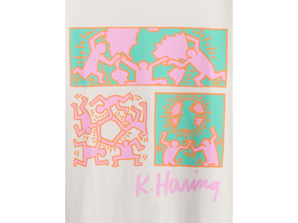 Dámské tričko s grafikou Keitha Haringa spojuje pohodlí, styl a uměleckou inspiraci v jednom nadčasovém kousku. Je vyrobeno z měkkého bavlněného žerzeje, který zajišťuje celodenní komfort, zatímco originální grafika legendárního umělce Keitha Haringa na přední straně dodává tričku jedinečný charakter. Klasický kulatý výstřih podtrhuje univerzální vzhled a relaxed fit nabízí volnější střih pro maximální pohodlí. Délka sahá ke kyčlím, což umožňuje snadné kombinování s různými outfity. Modelky ve velikosti S měří 172–180 cm, mají pas 60–66 cm a boky 84–97 cm, zatímco modelky ve velikosti XL měří 172–180 cm, mají pas 86–91 cm a boky 114–127 cm. Pokud preferujete užší střih, doporučujeme zvolit o jednu velikost menší.Doplňkové parametry