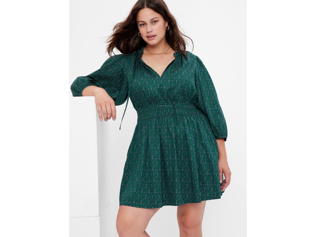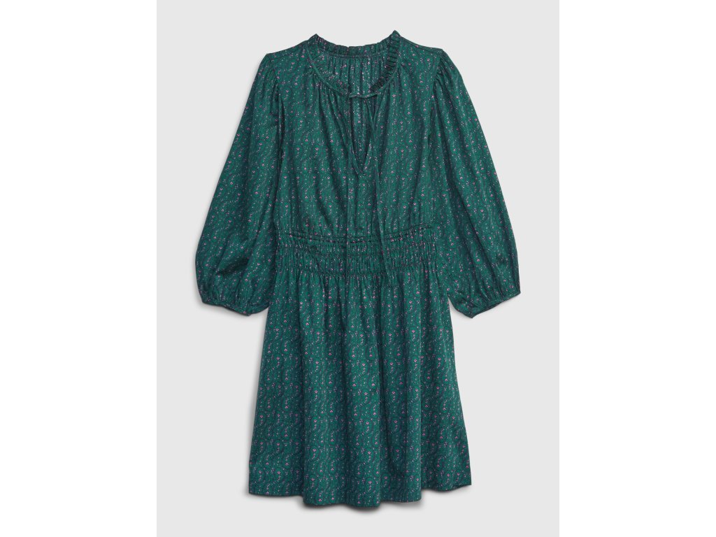 Dámské vzdušné bavlněné mini šaty. Drobný plošný vzor na zeleném podkladu. Kulatý výstřih s drobným volánkem. Výstřih kombinovaný s véčkem a šňůrkou na zavazování. Nabírané 3/4 balónové rukávy. Zvýrazněný pas s pružným žabičkováním. Krátká sukně v áčkovém střihu. 100% bavlna.Doplňkové parametry