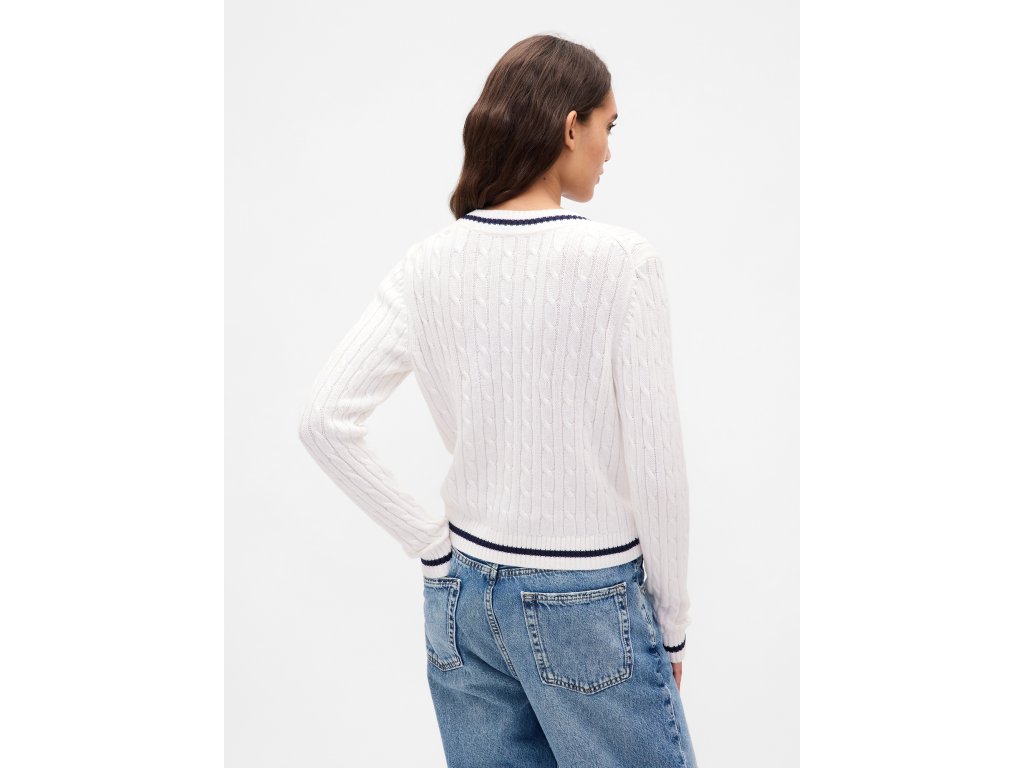 Dámský kardigan z bavlněného úpletu je pohodlný, měkký na dotek a ideální pro každý den. Má copánkový vzor, výstřih do V, knoflíky po celé délce a dlouhé rukávy s žebrovanými manžetami. Na hrudi je jemné vyšívané logo GAP. Styl podtrhují kontrastní pruhy na spodním lemu. Rovný střih s kratší délkou sahá do pasu a hezky zvýrazní siluetu. Modelky ve velikosti S měří 172–180 cm, mají pas 60–66 cm a boky 84–97 cm. Ve velikosti XL měří 172–180 cm, pas 86–91 cm a boky 114–127 cm.Doplňkové parametry