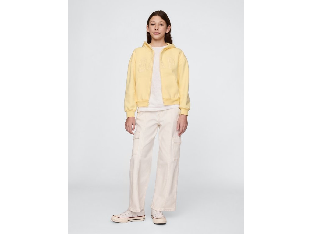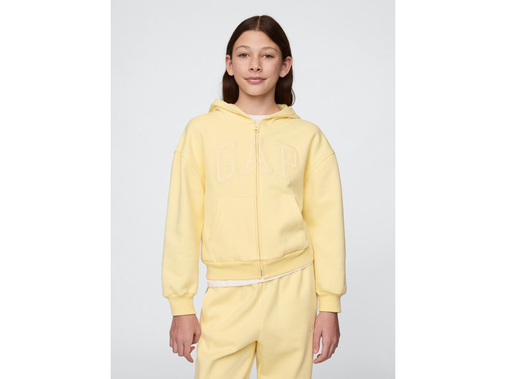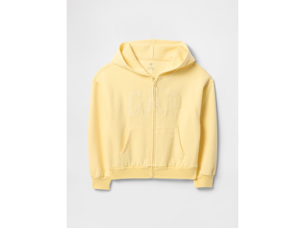 Pohodlná dětská oversize mikina na zip z měkké směsi bavlny a fleecu je ideální volbou pro ležérní styl a maximální pohodlí. Má kapuci, dlouhé rukávy s žebrovanými manžetami a zapínání na zip po celé délce. Praktické klokaní kapsy nabízejí dostatek prostoru pro drobnosti nebo zahřátí rukou. Na přední straně se nachází ikonické logo Gap, které dodává mikině moderní vzhled. Vyrobena s 23 % recyklovaného polyesteru, tato mikina přispívá ke snižování spotřeby zdrojů a odpadu. Produkt vznikl ve výrobním závodě podporujícím rovnost pohlaví a posilování postavení žen prostřednictvím programů RISE a P.A.C.E. od Gap Inc. Oversized střih poskytuje volnost a uvolněný styl. Délka sahá k bokům, což z ní činí skvělý kousek pro vrstvení i samostatné nošení. Ideální pro relaxaci, volnočasové aktivity nebo každodenní nošení. Pokud preferujete užší střih, doporučujeme zvolit menší velikost. Materiál: 77% Cotton 23% PolyesterDoplňkové parametry