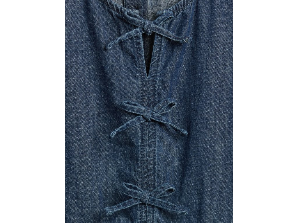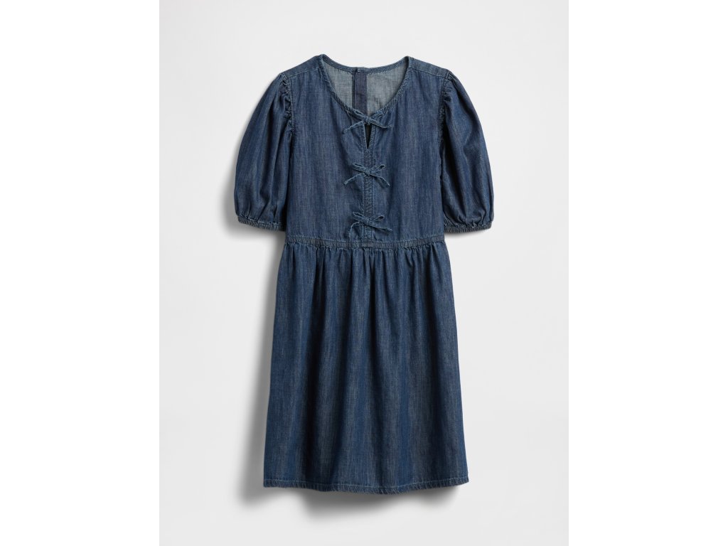 Dívčí džínové šaty z pevného denimu s ozdobnými mašlemi kombinují klasický vzhled s pohodlím na každý den. Vyrobeny z autentického, nepružného denimu v tradičním modrém odstínu, který je odolný a zároveň příjemný na nošení. Kulatý výstřih se zapínáním na knoflíky vzadu usnadňuje oblékání, přední část zdobí ozdobné mašle a nabírané rukávy s pružnými manžetami dotvářejí celkový vzhled. Elastický pas vzadu zajišťuje pohodlné padnutí a volnost pohybu. Relaxed střih je rovný, šaty sahají nad kolena. Vyrobeno v rámci programu Washwell, který při výrobě denimu šetří vodu, a v továrně podporující rovnost pohlaví prostřednictvím iniciativy RISE. Materiál: 100% Cotton Better CottonDoplňkové parametry
