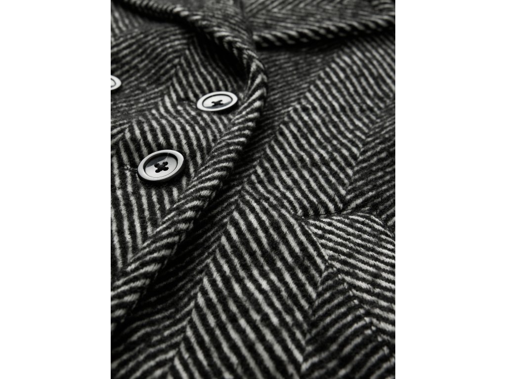 Elegantní tvídový kabát z měkké polyesterové směsi. Má klopový límec a dlouhé rukávy. Zapínání na knoflíky a šikmé přední kapsy. Kabát je také plně podšitý, což zajišťuje extra teplo a pohodlí. Je vyroben z 96 % recyklovaného polyesteru. Kromě toho, vlna použitá v tomto kousku pochází z etických zdrojů – Responsible Wool Standard. Má rovný a pohodlný střih.Doplňkové parametry