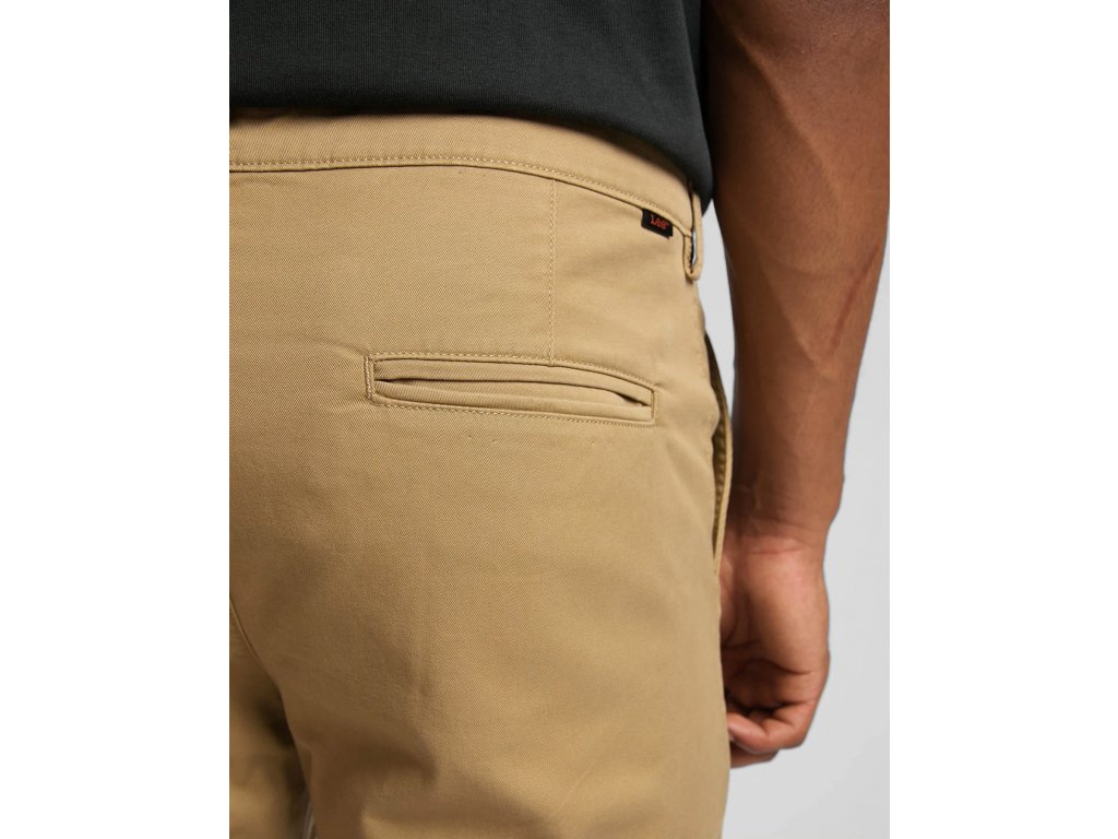 Přední kapsy jsou ušity v rovném střihu a zadní kapsy mají kalhotový styl. Nechybí ani nášivka s logem značky LEE.
